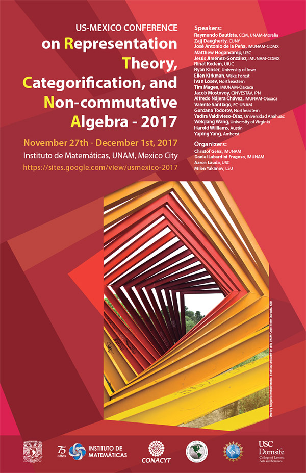 Third Meeting of the US-Mexico Conference on Representation Theory, Categorification, and Noncommutative Algebra, to be held between November 27th – December 1st, 2017 at Mathematics Institute of UNAM in Mexico City.